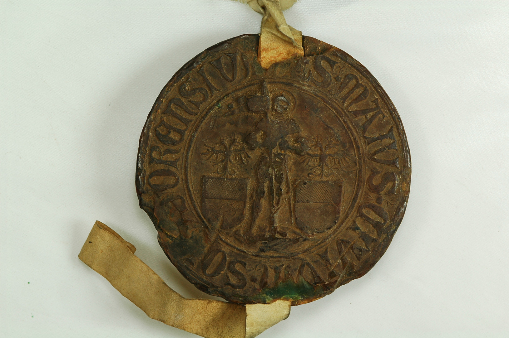 Santo guerriero stante su di un terreno naturale, rivestito d'armatura, tenente la spada al fianco con la sinistra e una lancia banderuolata alla croce con la destra. La figura è affiancata da due scudi arrotondati al capo, sormontati ciascuno da un'aquila bicipite coronata su entrambe le teste