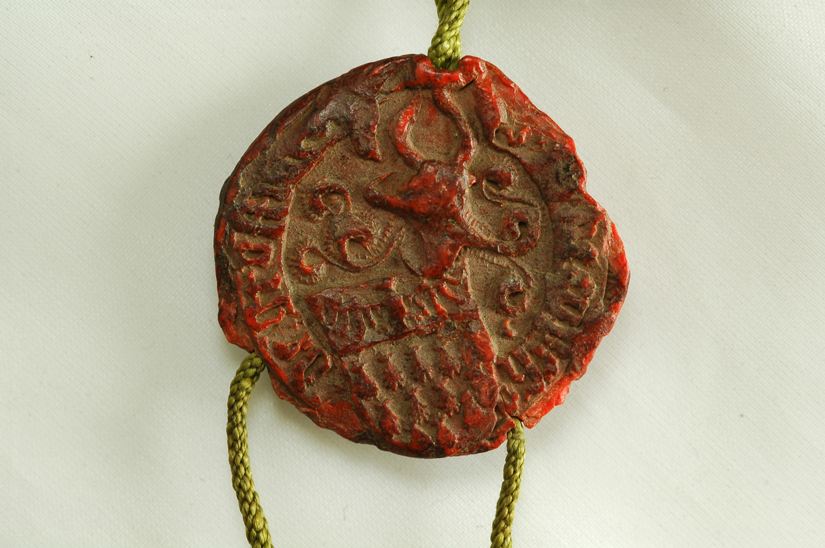 Ipronta frammentaria. Si conserva uno scudo inclinato palato, al capo, tenuto da due sirene. Scudo e tenenti interrompono la legenda