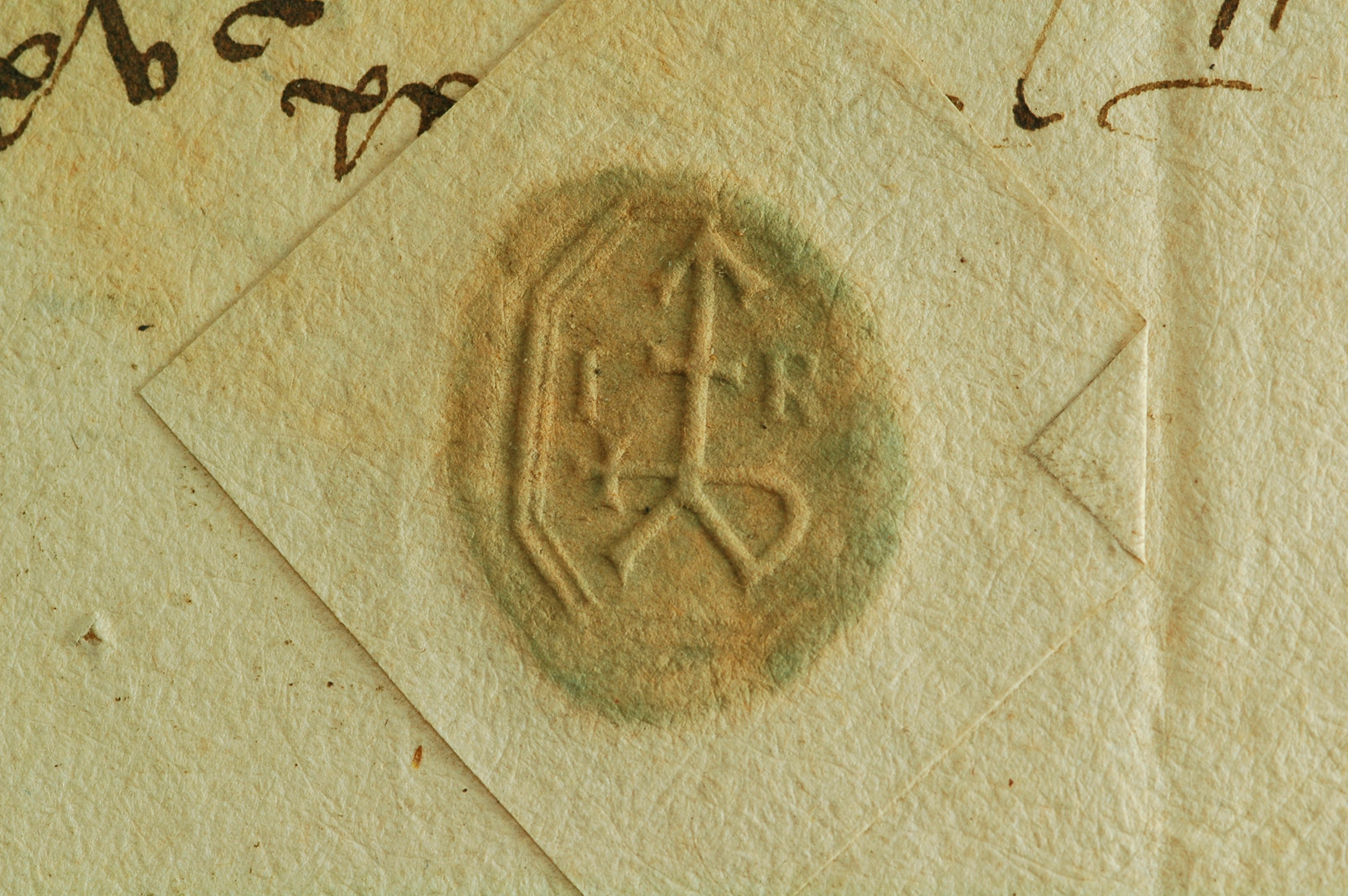 Marca mercantile, costituita da una V rovesciata, sostenente una freccia attraversata da un segmento orizzontale al centro e, nel punto di contatto con la V, da un altro segmento orizzontale più lungo, crociato a destra e collegato a sinistra con il tratto della V tramite un tratto ricurvo. La marca è accostata dalle lettere I e R