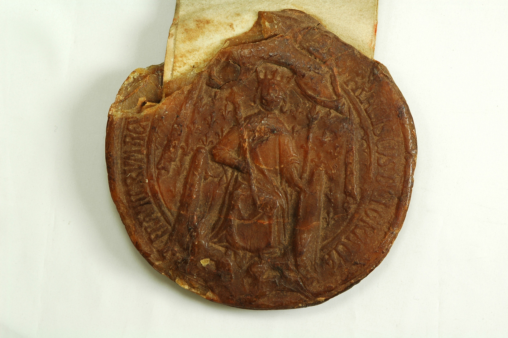 Sovrano coronato, assiso su uno scranno coperto d'un drappo, con la mano di giustizia nella sinistra e lo scettro nella destra, sotto un baldacchino seminato di gigli. La figura poggia su due leoni guardanti, accucciati e addossati che interrompono la legenda
