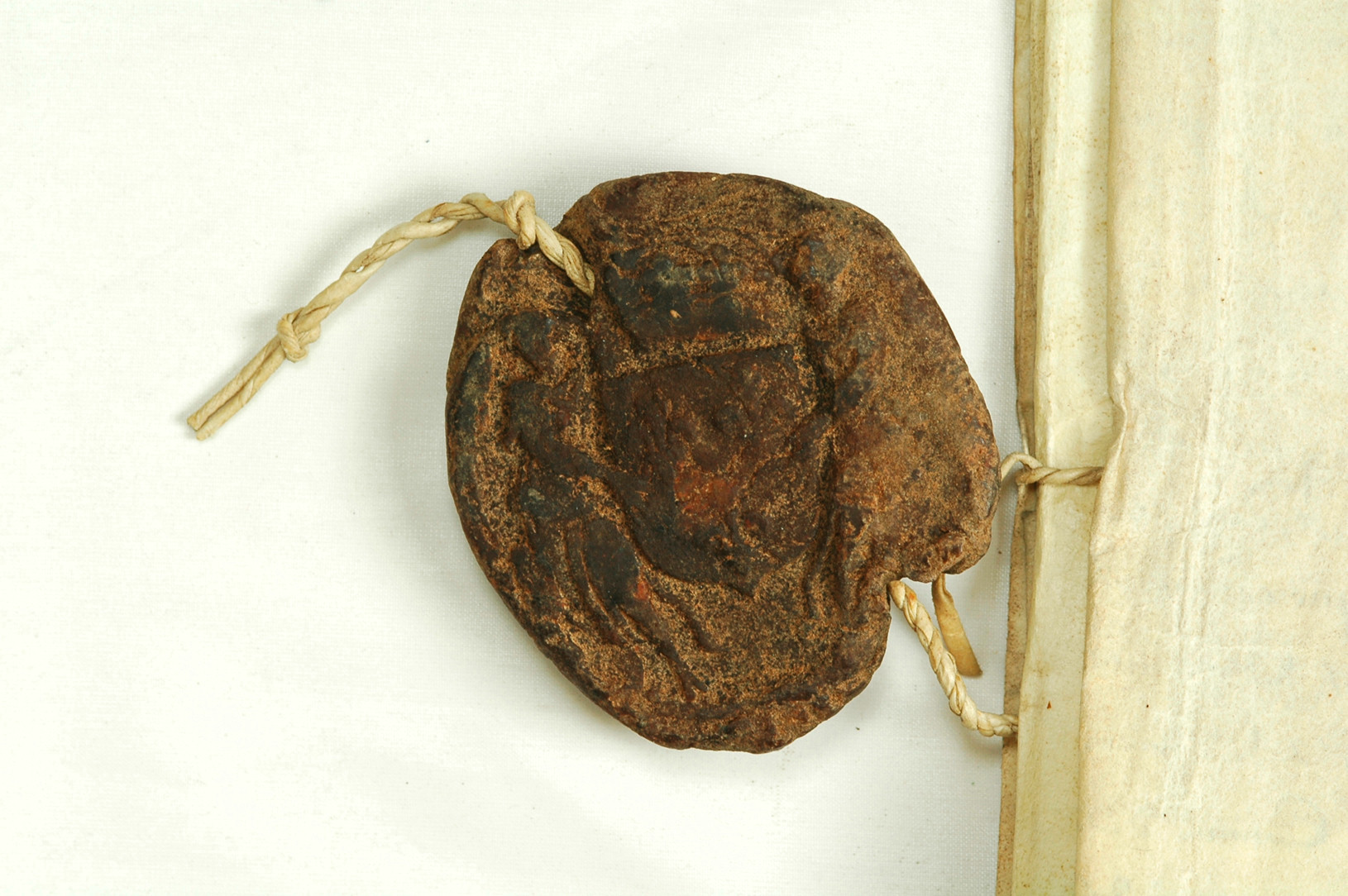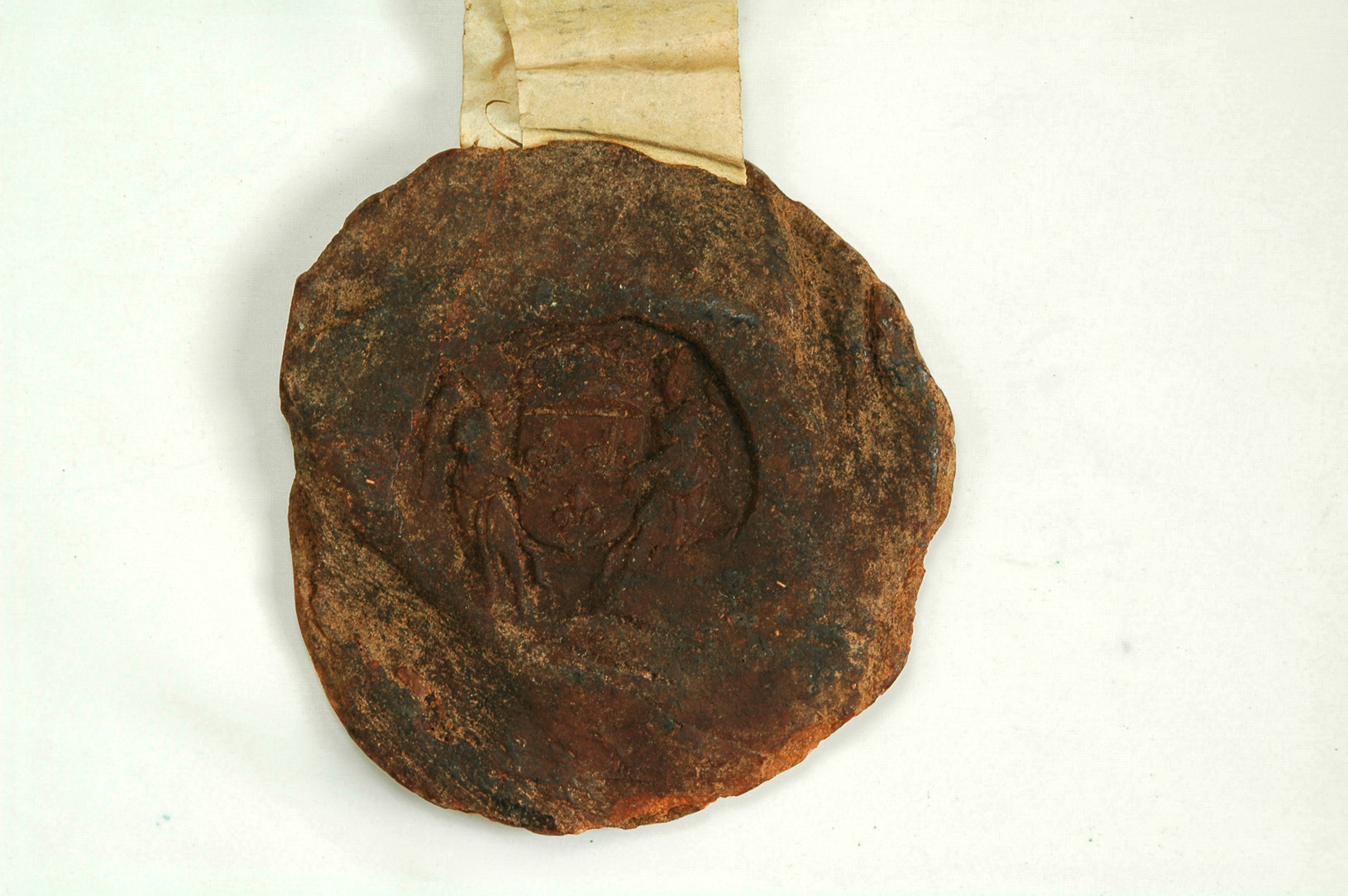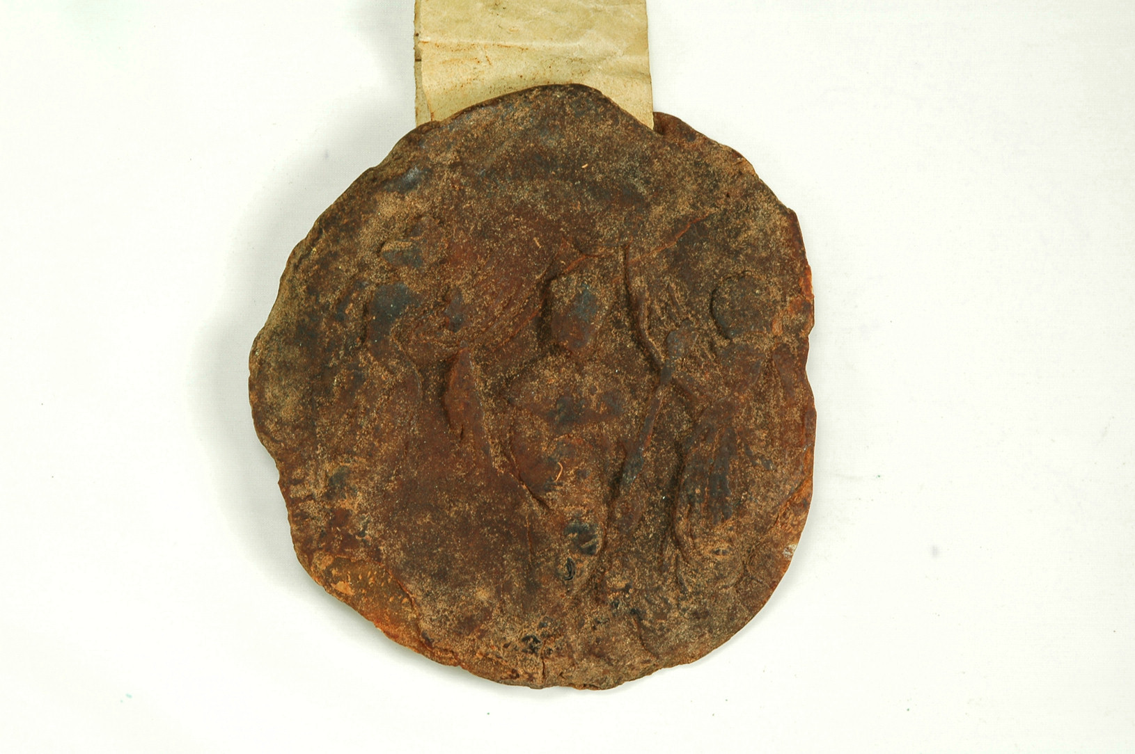 Sovrano coronato, con il collare dello Spirito Santo, tenente nella sinstra la mano di giustizia e nella destra lo scettro e il globo, assiso sotto un padiglione seminato di gigli, sollevato alle estremità da due angeli. Ai piedi della figura si trovano due leoni accucciati e affrontati