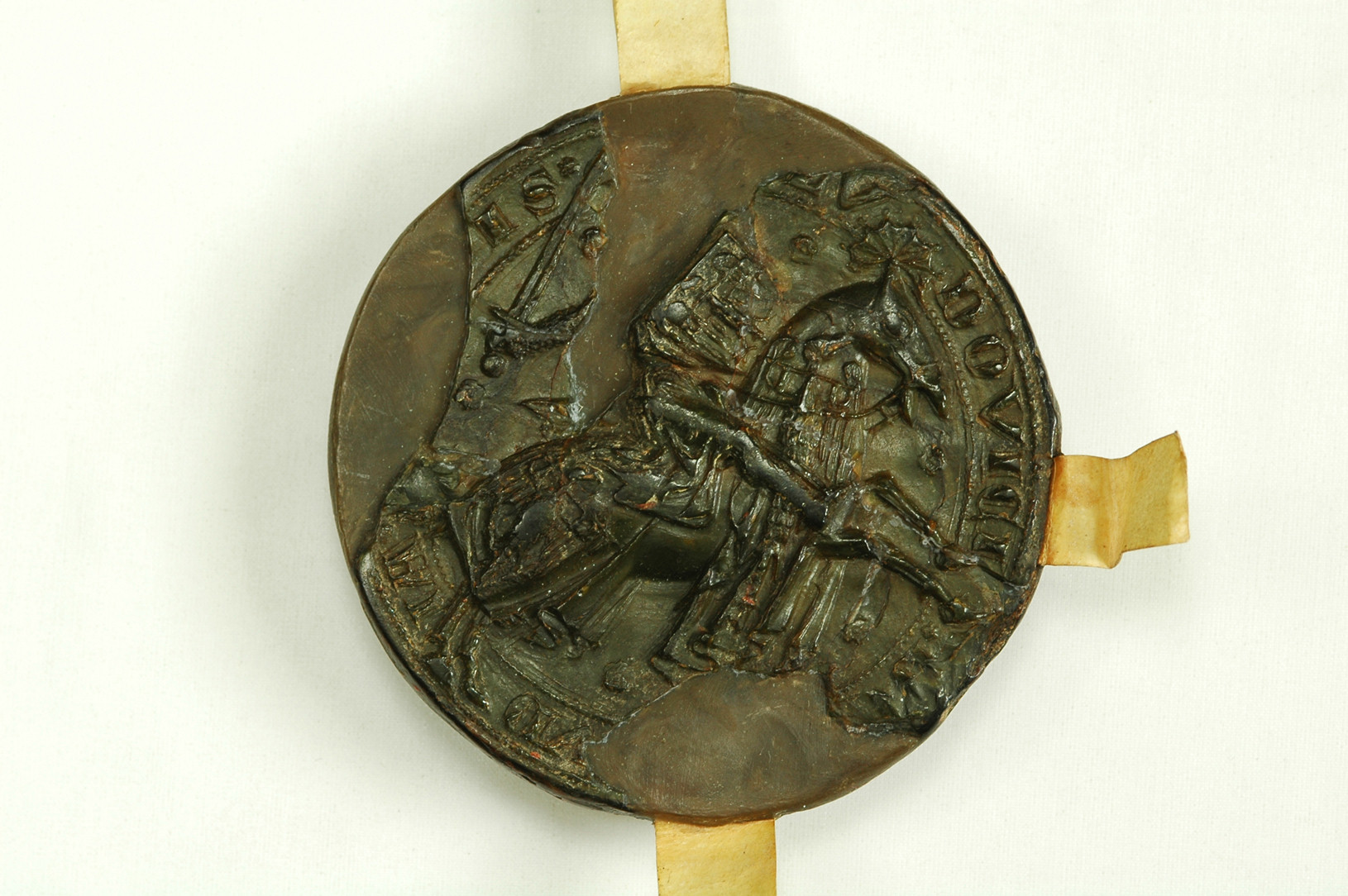 Cavaliere al galoppo verso destra con elmo tinale cimato da uno schermo semicircolare a sei punte, che si ripete sulla testa del cavallo; il cavaliere tiene la spada sguainata nella destra e lo scudo nella sinistra. Sul fondo del campo sei rosette. La spada, il cimiero, la testa, le zampe e la coda del cavallo interrompono la legenda. Scudo e sulla gualdrappa all’aquila carica d’un lambello a cinque pendenti